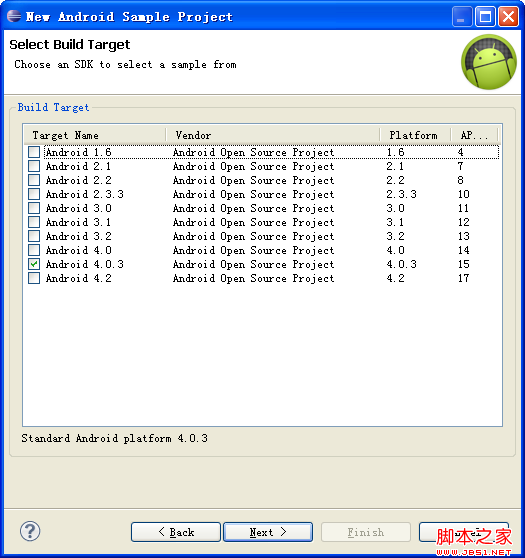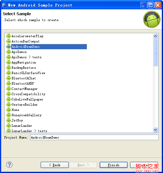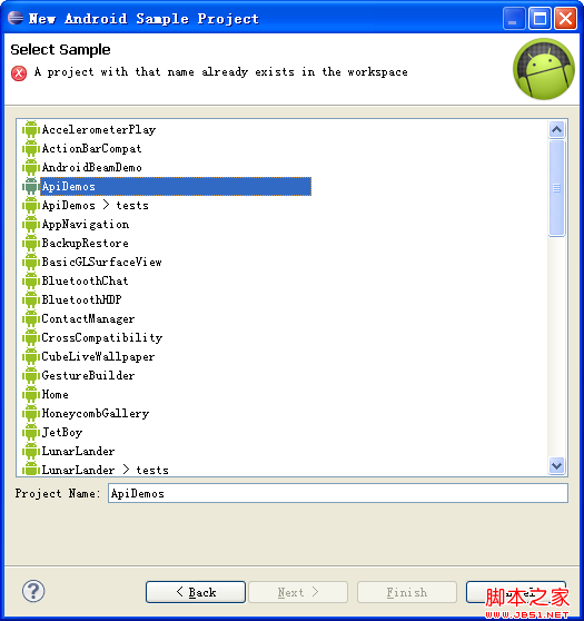 选择你需要研究的Sample类型,ApiDemos是最基本的,很适合初学者。按“Finish”就完成了。