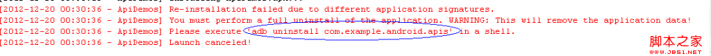 编译运行时注意模拟器上本来就含有ApiDemos应用,这导致以下出错信息。需要在 SDK 安装目录(X:\Android\android-sdk\platform-tools)下执行提示中命令“adb uninstall com.example.android.apis”来先卸载原有ApiDemos应用。