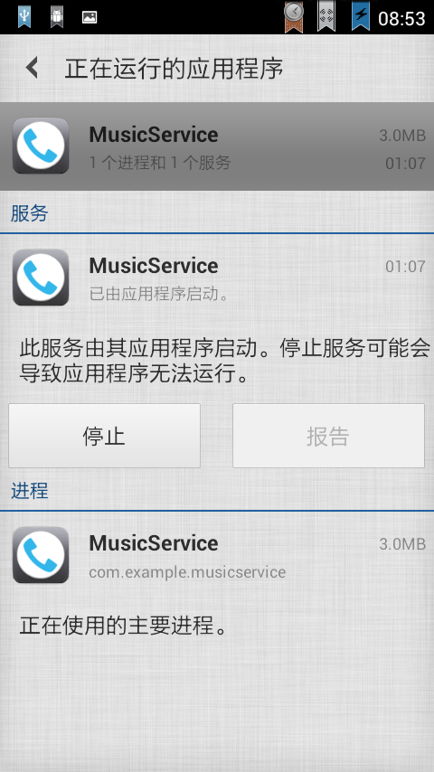 当按第一个按钮的时候,使用startService()方法启用服务,即使退出activity,服务还在,音乐会继续播放。查看程序运行状态: