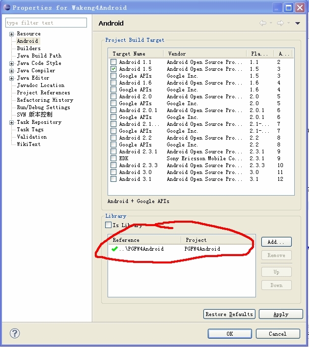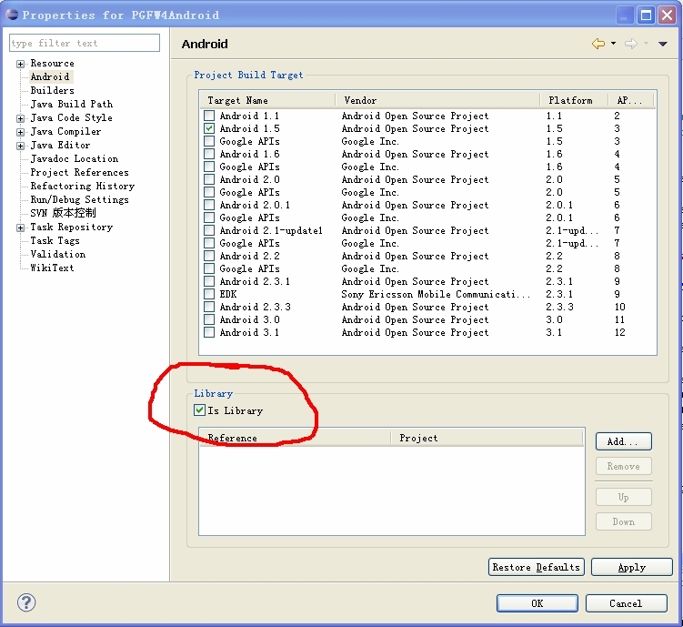 现有的项目引用库项目的时候,也只需要打开项目属性设置面板,在Android选项卡下添加需要引用的项目(如下图所示)。