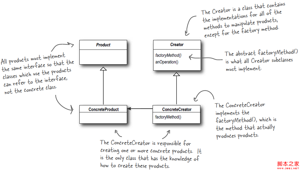 抽象产品类Product负责定义产品的共性,实现对事物抽象的定义;Creator是抽象创建类,也就是抽象工厂,具体如何创建产品类是由具体的实现工厂ConcreteCreator完成的。其中在《Head First Design Patterns》对工厂方法模式做了细节的说明,原文如下: