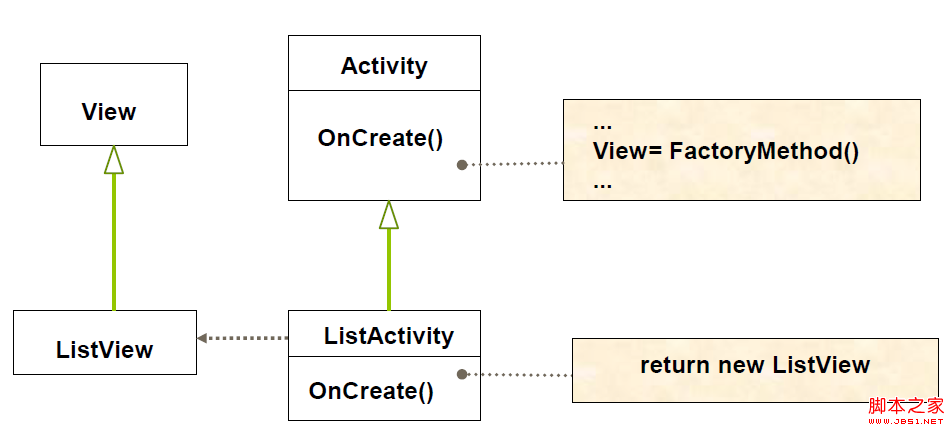 总结:Activity作为“工厂方法”,具体View中显示什么由默认设置或者由子类来实现;ListActivity作为具体实现,它决定在View中显示的是ListView;这里的View是Activity中的默认显示,即为“Product”,而ListView是“ConcreteProduct”,由ListActivity来决定显示。