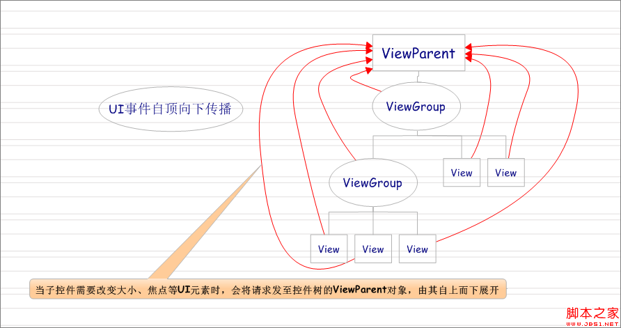 交互事件,是指当用户通过按键、触摸、滑动等操作与应用进行交互时触发的相关事件。通过Android控件树可知,交互事件是沿着控件树自顶向下传播的。其中Android控件树简要图如下所示: