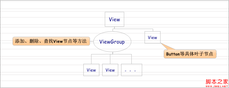 现在来看看它们是如何利用组合模式组织在一起的,首先在View类定义了有关具体操作,然后在ViewGroup类中继承View类,并添加相关的增加、删除和查找孩子View节点,代码如下: