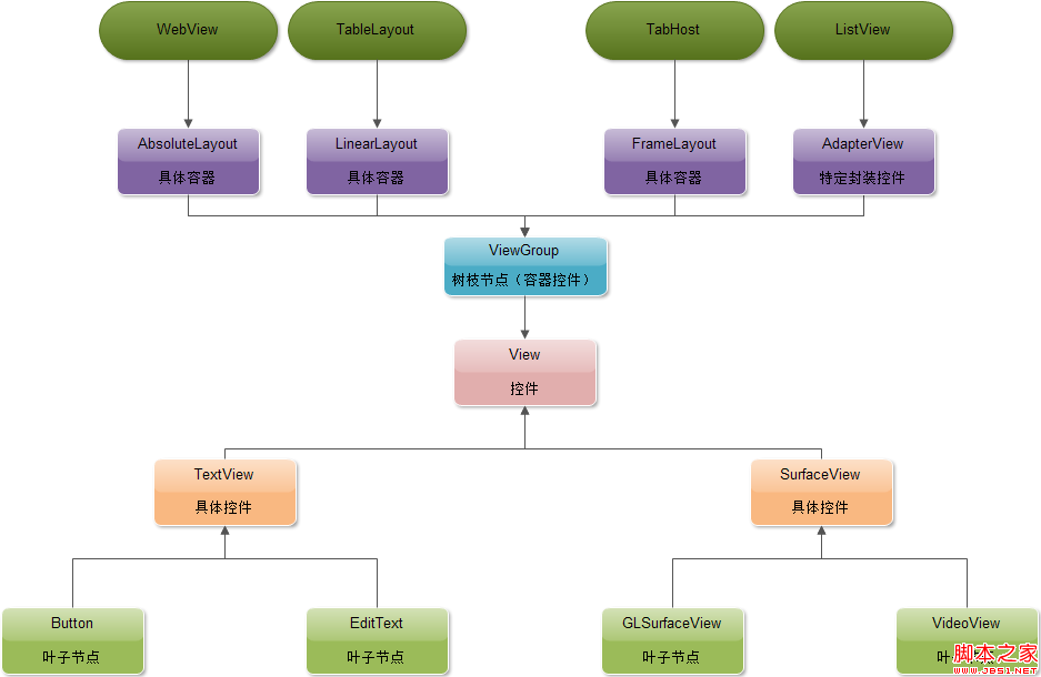 注:其中使用(继承)到ViewGroup类的有我们常用的容器类(包装和容纳各种View),如LinearLayout、FrameLayout等,代码如下: