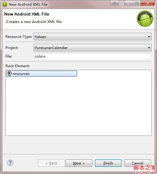选择 Resource Type -> Values,输入文件名 -> colors,选择 Root Element -> resources,点击 Finish。