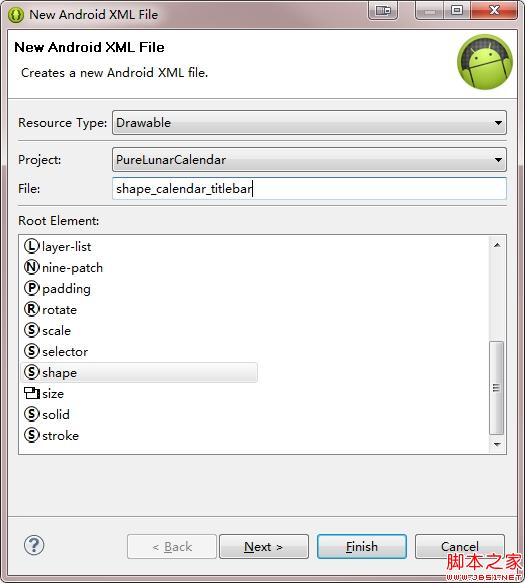 选择 Resource Type -> Drawable,输入文件名 -> shpae_calendar_titlebar,选择 Root Element -> shape,点击 Finish。
