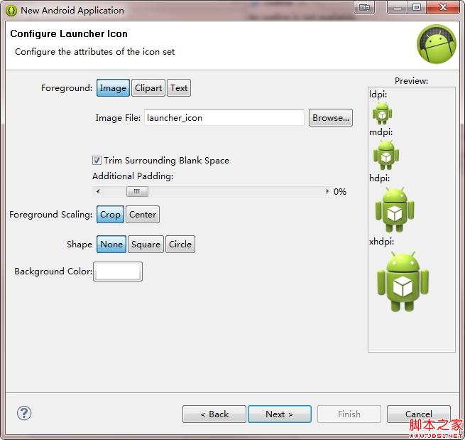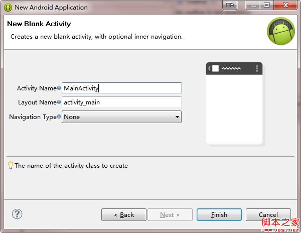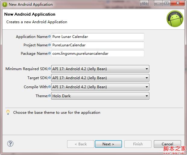 在新建对话框中输入 App 属性,SDK版本全部选最新的,不作版本兼容。主题选择 Holo Dark。
