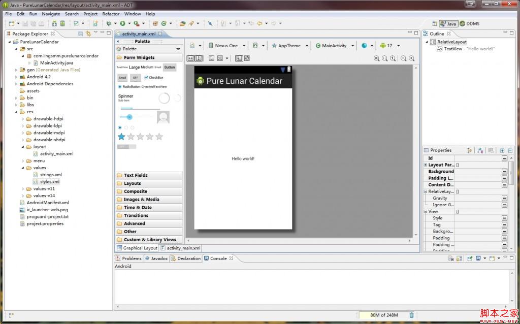 在上面的步骤中,我们选择了创建 MainActivity,ADT 帮我们在 src 目录下生成了 MainActivity.java 文件,在 res/layout/ 目录下生成了 activity_main.xml 文件,并在编辑窗口打开,如上图,是 UI 界面定义文件,这是一个标准的 xml 文件,显示的图像就是由编辑器解析 xml 文件描绘出来的。点击下方的 "Graphical Layout" 和 “activity_main.xml" 可以在图形编辑 和 xml 文本编辑器之间切换。