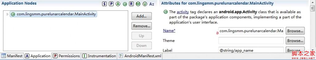 如下图,双击打开 AndroidManifest.xml,选择 Application 标签页,选中 Application Nodes 中的 MainActivity,右边的 Name 属性是错误的,点击 Browse 重新选择,设为:com.lingsmm.purelunarcalendar.ui.acivity