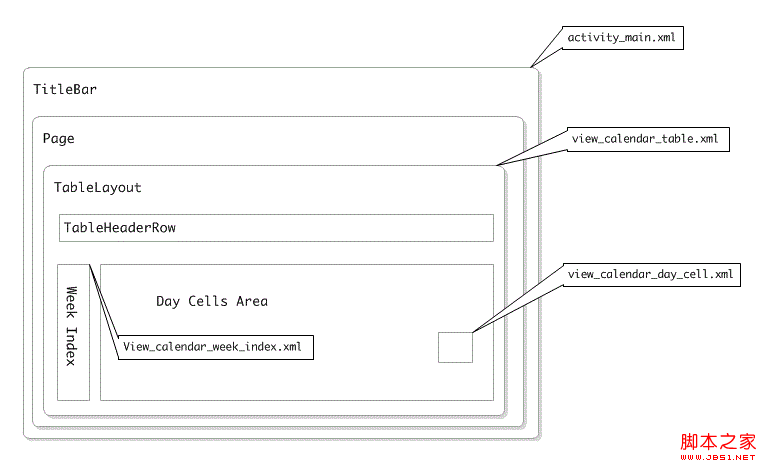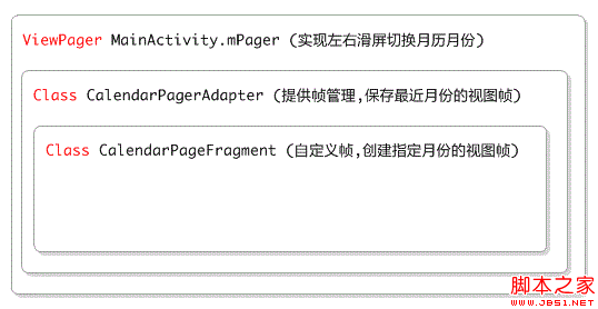 因为要实现左右滑屏,这里采用的方案是使用 ViewPager。CalendarPagerAdapter 为 ViewPager 提供多帧管理,我们设计的目标是显示公历 1901 - 2100 年区间的月历,相应的帧画面有 (2100 - 1900) * 12 幅帧画面,如果多创建出来,将占用非常大的内存资源。将由 ViewPager 来管理,由它决定某一帧何时创建,何时销毁,以节约内存资源。更多信息请参考:http://developer.android.com/reference/android/support/v4/view/ViewPager.html