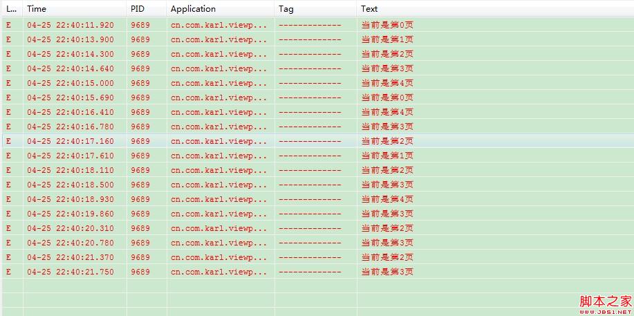 忘记了,这种效果不太好用图片演示,大家自己演示吧!滑动到最后一张,再滑动就是进入了第一页。下面看下我logcat下的打印: