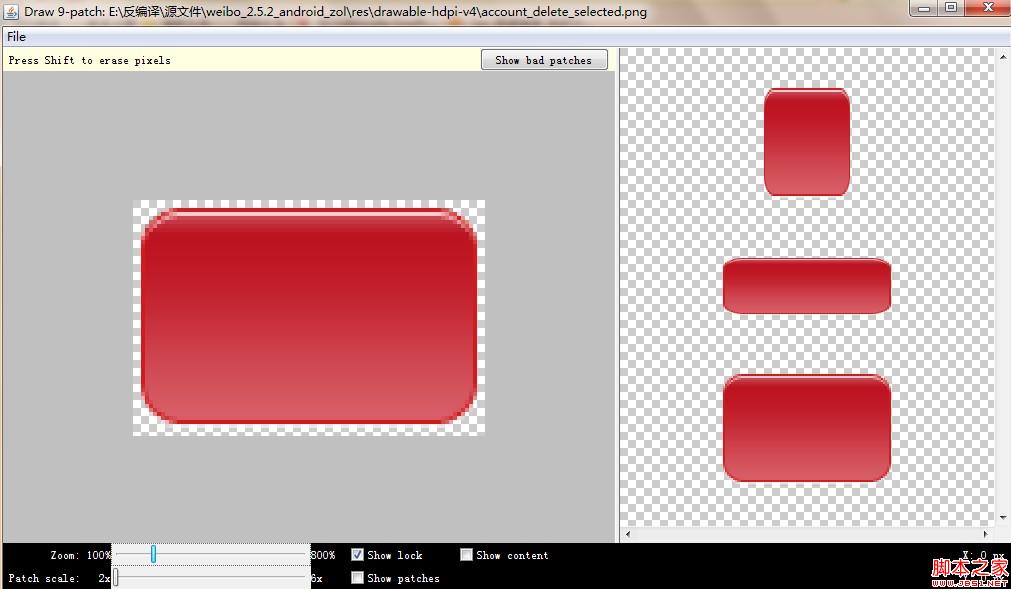 在android开发的过程中我们经常因为没有好的美工图片失真,这样使界面看起来要逊色很多,有的时候可能我们会想在drawable-hdpi,ldpi,mdpi下放不同分辨率的图片,这样虽然可以有效避免图片失真,但是这样一是麻烦而是图片资源似的整个项目太大。所以有时候我们想要是有些图片可以拉伸而不失真多好啊,这时候我们就要想起android为我们提供的9.png格式的图片了,9.png格式的图片是安卓平台上新创的一种被拉伸却不失真的玩意。