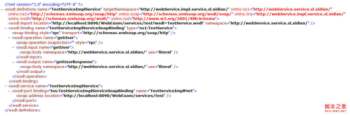 3.到此服务器端的已经建立完全,我们可以测试下:开启tomcat,然后在浏览器中输入http://localhost:8090/WebExam/services/test?wsdl可以查看wsdl