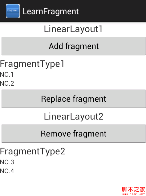 实例程序 写了个小程序实践了一下fragment的管理,程序不是很完善,就是试试基本用法,先按第一个按钮添加一个fragment,第二个按钮将其替换,第三个按钮将第二个按钮添加的fragment删除。