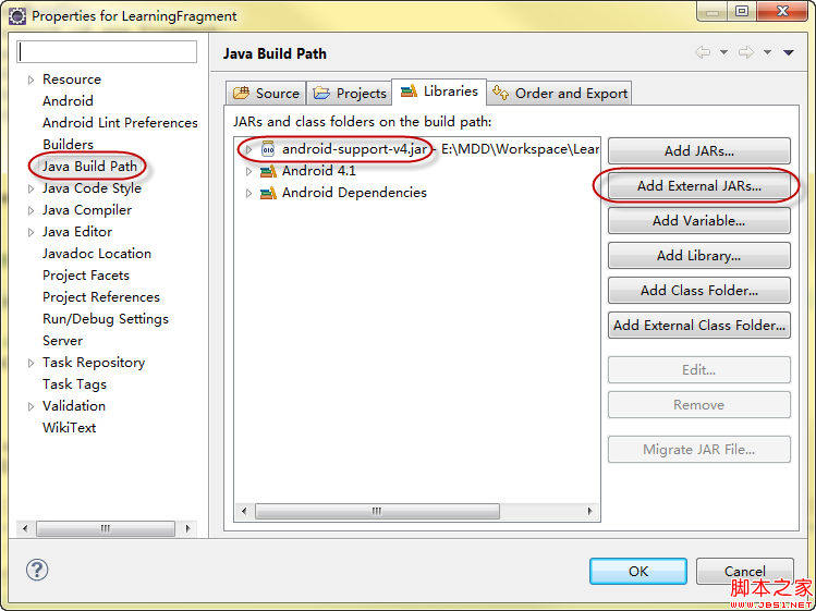 同时应该将上述的包拷入libs项目下的libs文件夹,然后在项目的Properties中添加:右键单击项目,选Properties,左边选Java Build Path,然后Add External JARs…,添加android-support-v4.jar.