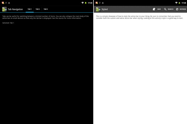 这个项目的UI很漂亮,使用也很方便,demos中提供了很好的参考实例。能在低版本上实现ActionBar(系统的ActionBar在3.0以上才有)。