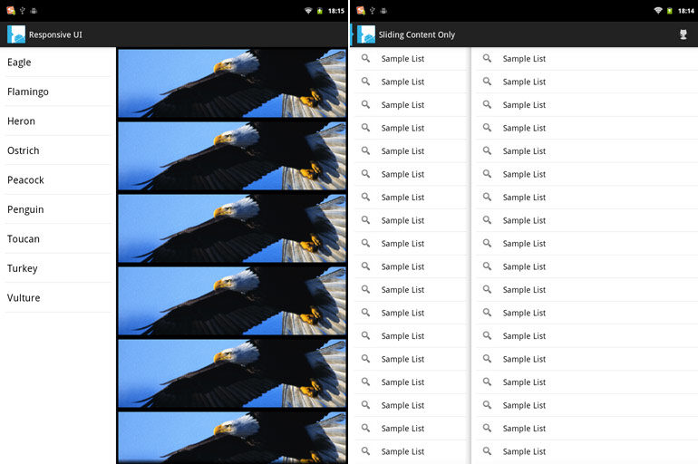 你需要用推拉式的效果,这是个不错的项目。不过你直接用可能没法用,它是依赖于ActionBarSherlock项目的。代码中也有问题,需要把SlidingFragmentActivity 这个类改成继承SherlockFragmentActivity(也就是ActionBarSherlock中的类),因为这个问题我也是找了很久都没有解决(一直没有怀疑过代码问题),后来实在不行就看看代码才发现的。