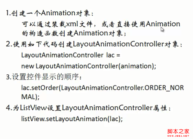 * 4.LayoutAnimationController可以在xml文件当中设置,也可以在代码中进行设置