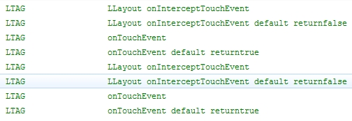 结论:LLayout中onInterceptTouchEvent返回了true,对触摸事件进行了拦截,所以没有将事件传递给View,而直接执行了LLayout中的onTouchEvent事件;