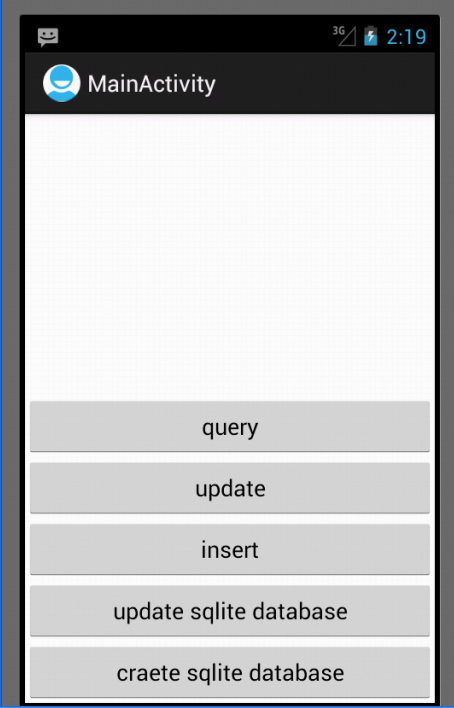 该程序的界面设计比较简单,因为需要完成6中功能,所以在界面中只有6个按钮,每个按钮对应一种功能,这些按钮的功能依次为新建数据库,更新数据库的版本,向数据库中插入记录,更新数据库中的记录,查询数据库中的记录,删除数据库中的记录。其界面效果如下: