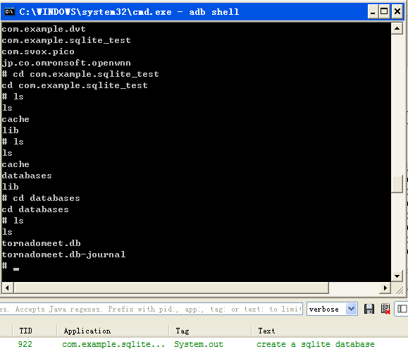 运行模拟器,单击create sqlite database按钮,创建一个名为”tornadomeet”的数据库,版本号为1,这时候可以看到程序终端显示”create a sqlite database”字样。在cmd中输入如下命令:adb shell;cd data; cd data; ls; cd com.example.sqlite_test; ls;命令,其中com.example.splite是本程序的包名,输入最后ls命令后可以看到有2个文件夹cache, lib。然后在单击后继续ls命令查看,多了一个database文件夹。使用命令cd database进入该文件夹后ls发现里面有数据库,截图如下: