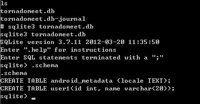 继续在cmd命令行输入sqlite3 tornadomeet.db;(其中tornadomeet为单击创建数据库后新建立的数据库名称。)输入 .schema;(注意前面有个点)显示如下: