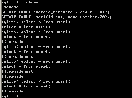 单击模拟器的insert按钮,进入sqlite对应的数据库后,输入select * from user1;命令后(带分号)可以看到有如下显示:1 | tornado,说明我们的数据库成功插入了一条记录,该记录的内容是在程序中静态给的。