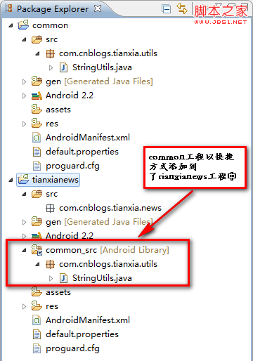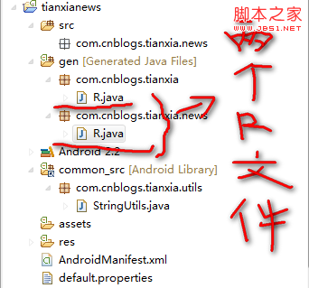 eclipse为了生成了两个R.java,一个是common工程的,一个tianxianews工程的,但是内容是一摸一样的,这样做的好处是:R.java里面的内容包括两个工程资源,第一,tianxianews工程通过R.java能调用到common工程的资源;第二,如果有覆写的资源,生成apk的时候,tianxianews工程覆盖common工程的资源,因为两个R.java内容一样,common代码调用的R.java中的资源,实际上调用的是tianxianews资源,这个特性类似如面向对象的继承的概念。
