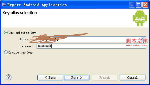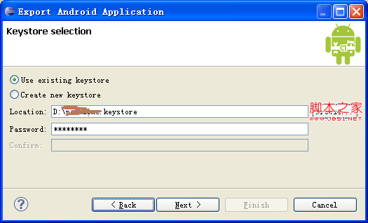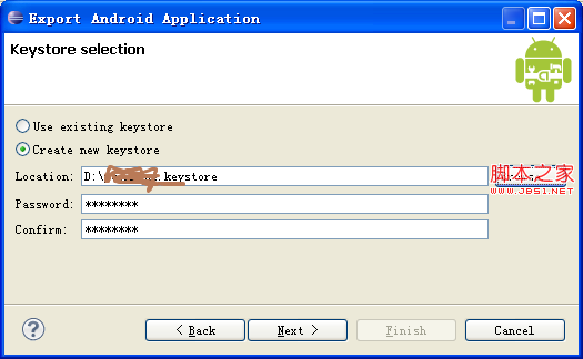 第二步:创建密钥库keystore,输入密钥库导出位置和密码,记住密码,下次Use existing keystore会用到。