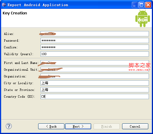 第三步:填写密钥库信息,填写一些apk文件的密码,使用期限和组织单位的信息。