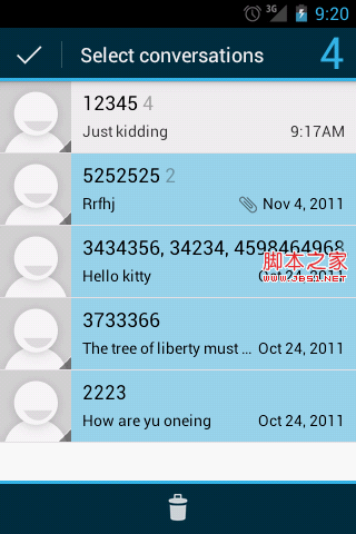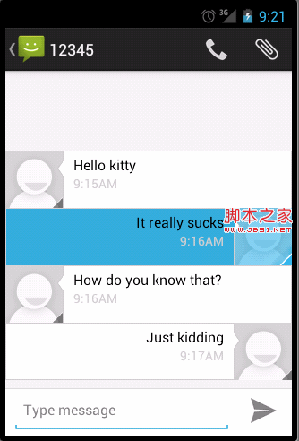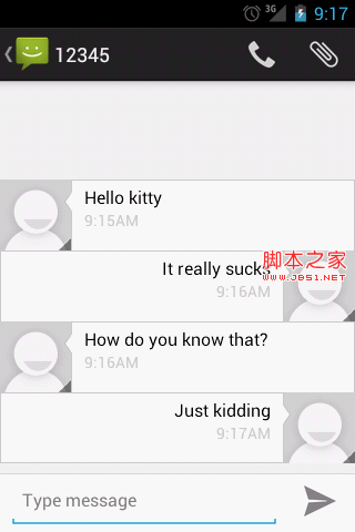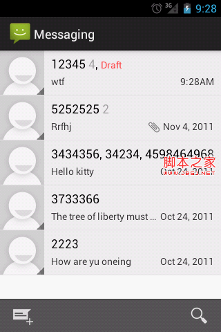 这个也够脑残的,这个页面有多丑就先不说了,就说为什么在每条信息的边上都要放置联系人联系人头像呢?每个对话的联系人只有发信人和收信人,也就是说对于一个对话中的所有消息来讲这些联系人是不变的,既然不变为什么要重复显示呢?这不但会增加内存消耗,也会影响加载速度和操作的流畅度。更加令人难以理解的是,对于发出去的信息,如果点击联人头像,屏幕会先黑一下,然后弹出”无此联系人!“。因为,对于发出去的信息的联系人应该对应于People应用中的Me,所以如果不设置Me的相关信息就会显示”无此联系人“,至于为什么屏幕会先黑一下,是因为它要显示一个Activity的对话框,此Activity会检查联系人是否存在(是否有联系人信息),如果没有则弹消息”无此联系人“。