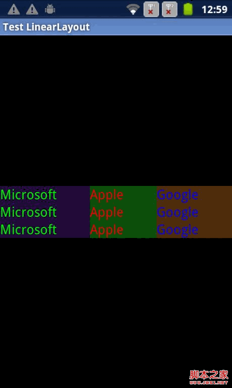 因为XML布局会在编译时被处理,如果有非法的值,会有编译错误的。我想这也就是Android特别鼓励开发者用XML来制作所有的布局的一个原因吧。实例,三个没有设置指向的线性布局,默认是水平放置,在代码中设置了几个离谱的值,发现它们还是水平的,也就是说设置离谱的值不会出错,但也不起作用:运行结果如下: