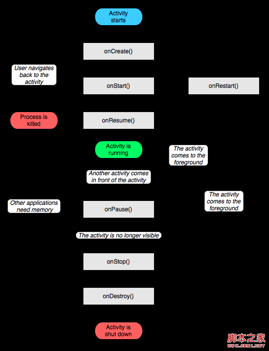 首先看一下Android api中所提供的Activity生命周期图(不明白的,可以看完整篇文章,在回头看一下这个图,你会明白的):