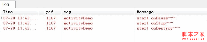当我们按BACK键时,我们这个应用程序将结束,这时候我们将先后调用onPause()->onStop()->onDestory()三个方法,如下图所示: