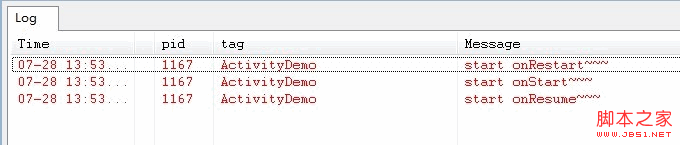 而当我们再次启动ActivityDemo应用程序时,则先后分别执行了onRestart()->onStart()->onResume()三个方法,如下图所示: