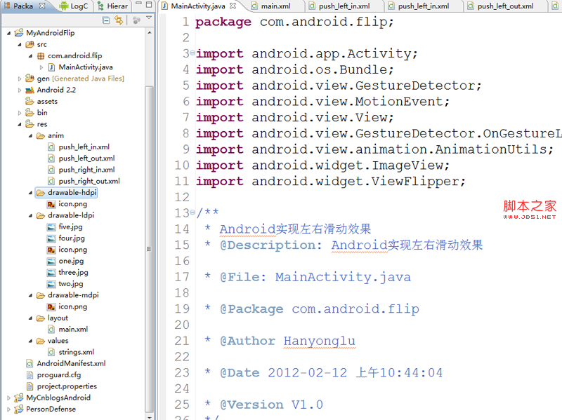 为了使其滑动时有一定的特效,我们需要加入Animation效果,说到Animation,我们先看下如何在Android中实现自定义Animation。自定义的Animation是以XML格式定义的,定义好的XML文件存放在res/anim中。