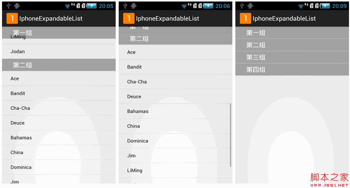 我们都知道Android缺省的ExpandableListView的group header无法固定在界面上,当向下滚动后,不能对当前显示的那些child 指示出它们归属于哪个group,在网上搜了很多关于仿手机QQ好友分组效果的ExpandableListView,发现都不尽如意,于是乎在别人的基础上改进了一点点,其实原理还是差不多的,只是增加了往上挤出去的动画效果,而且更加简单,只不过还是没有完全到达跟QQ一样的效果,希望有高手能实现更加逼真的效果,下面我们先看看效果图: