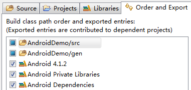 二、项目属性中Java Build Path->Order and Export中,确定Android Private Libaries与Android Dependencies这两项前面的选择框被选上后,