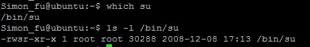 我们发现su也设置了SUID位,这样普通用户也可以运行su程序,su程序会验证root密码,如果正确su程序可以把用户权限提高的root(因为其设置SUID位,运行期是root权限,这样其有权限提升自己的权限)。