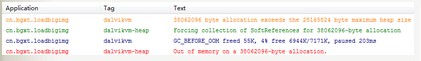 先来分析一下这个错误,首先dalvikvm(Android虚拟机)发现需要的内存38MB大于应用的堆内存24MB,这个时候尝试使用软加载的方式加载数据,我们知道当内存不足的时候dalvikvm会自动进行GC(Garbage Collection),大概清理了55k的空间出来,耗时203毫秒,但是内存还是不够,所以最后发生堆内存溢出的错误。