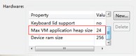 Android系统主要用于低能耗的移动设备,所以对内存的管理有很多限制,一个应用程序,Android系统缺省会为其分配最大16MB(某些机型是24MB)的空间作为堆内存空间,我这里使用的模拟器调试的,这个模拟器被设定为24MB,可以在Android Virtual Device Manager中查看到。