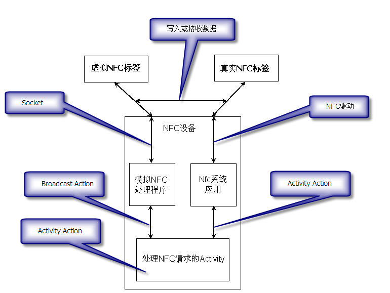 从图1可以看出,需要有一套虚拟的NFC标签,这些是在PC上用软件模拟的。对于虚拟NFC标签,通过Socket与安装在NFC设备中的模拟NFC处理 程序进行交互,然后该程序会发送Broadcast Action,最后接收到这个Broadcast后,会继续调用Activity Action调用处理NFC请求的窗口。这一点与Nfc系统程序一样,只不过中间多了一个发送broadcast的过程。因为模拟NFC处理程序与处理 NFC请求的NFCActivity所在的Library是分离的,只能通过Broadcast进行通知。而Nfc系统程序是通过NFC驱动感知真实 NFC标签是否靠近的。而对于处理NFC请求的窗口来说,不管是虚拟的NFC标签,还是真实的NFC标签,都处理同一个Activity Action。所以处理NFC请求的Activity可以共用一套代码。
