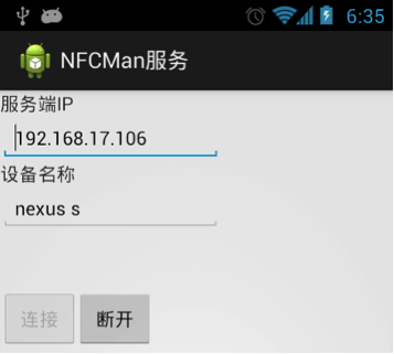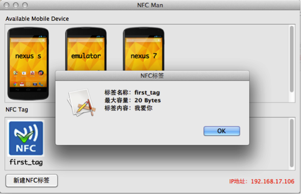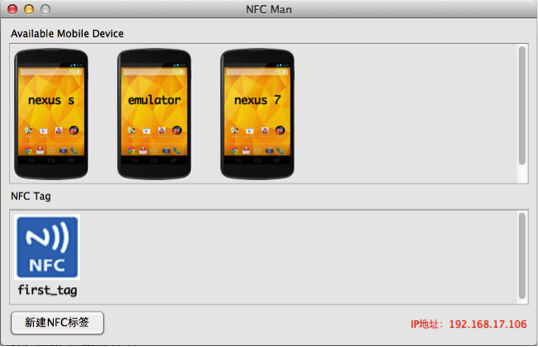 在图2中上面是模拟的NFC设备。只要Android手机(不需要支持NFC)或Android模拟器上运行的模拟NFC的应用(如图3所示)根据图2中右下角的IP连接到NFC模拟器,就会显示一个手机图标。