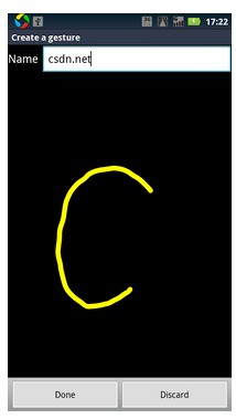 手势创建主要用到GestureOverlayView和GestureLibrary。GestureOverlayView的父类为android.widget.FrameLayout,是手势绘图区。GestureLibrary类主要对手势进行保存、删除等操作的,存放手势的仓库。下面给出创建手势的例子,如下图,可以定义如图手势打开csdn.net