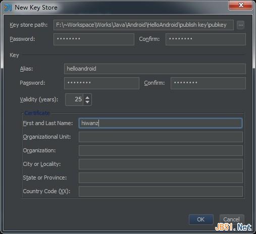 在弹出的Wizard对话框中需要指定签名的Key,一开始没有Key你可以点击Create New来新建一个Key用于签名,填入签名所需的一些字段后生成Key文件