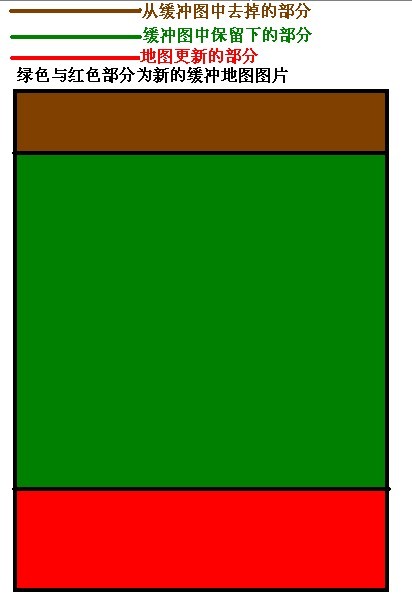 如图所示 地图向上移动后更新绿色的地图部分 与 将上次缓冲的红色部分结合起来就是新的游戏地图,其它方向原理完全一样。