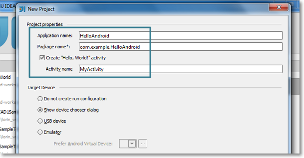 接下来就和使用Eclipse一样,填写Package name和Activity name,最重要的一项是Target Device一定要选择Show device chooser dialog。