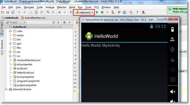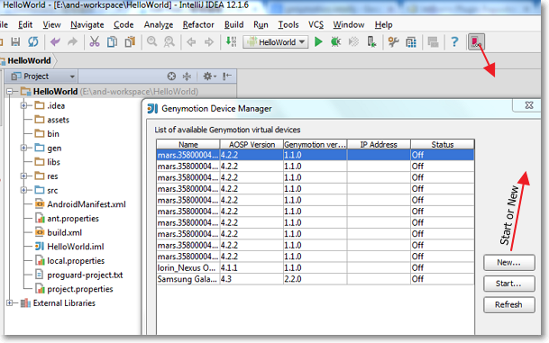 打开Intellij,并确保Genymotion的插件安装正确,下图的上方的红色剪头即为Genymotion的插件按钮,通过点击这个按钮,我们需要创建Android virtual device,我已经创建了多个,在此我选择lorin_Nexus开头的,并启动它。