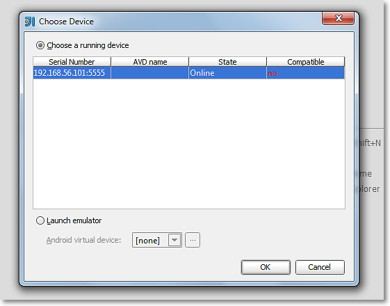 接着我们可以创建一个Android工程,并将该工程置于Android开发状态,最后一张图的红色框住的部分,默认为测试状态,然后点击红色框框的运行按钮,即会调出下方的Choose Device窗口,这就是我在强调的最重要的一项是Target Device一定要选择Show device chooser 的dialog原因。